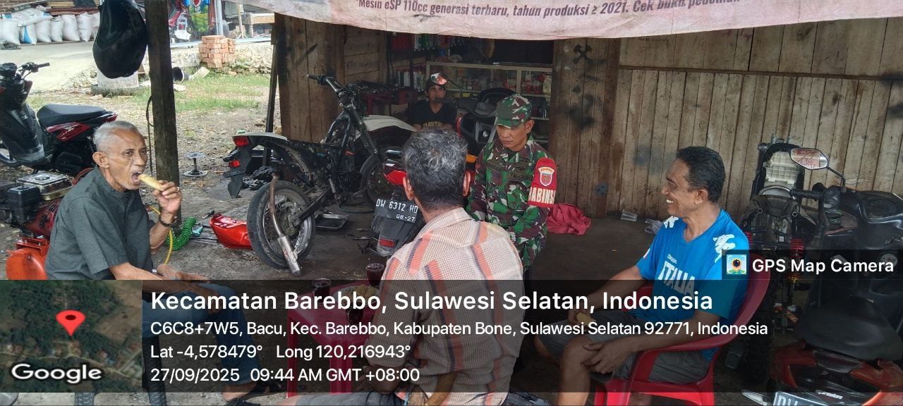 BONE – Babinsa Koramil 1407-11/Barebbo laksanakan komunikasi sosial dengan warga desa binaan tepatnya di Desa Bacu, kecamatan Barebbo, kabupaten Bone. Sabtu siang (27/09/25)