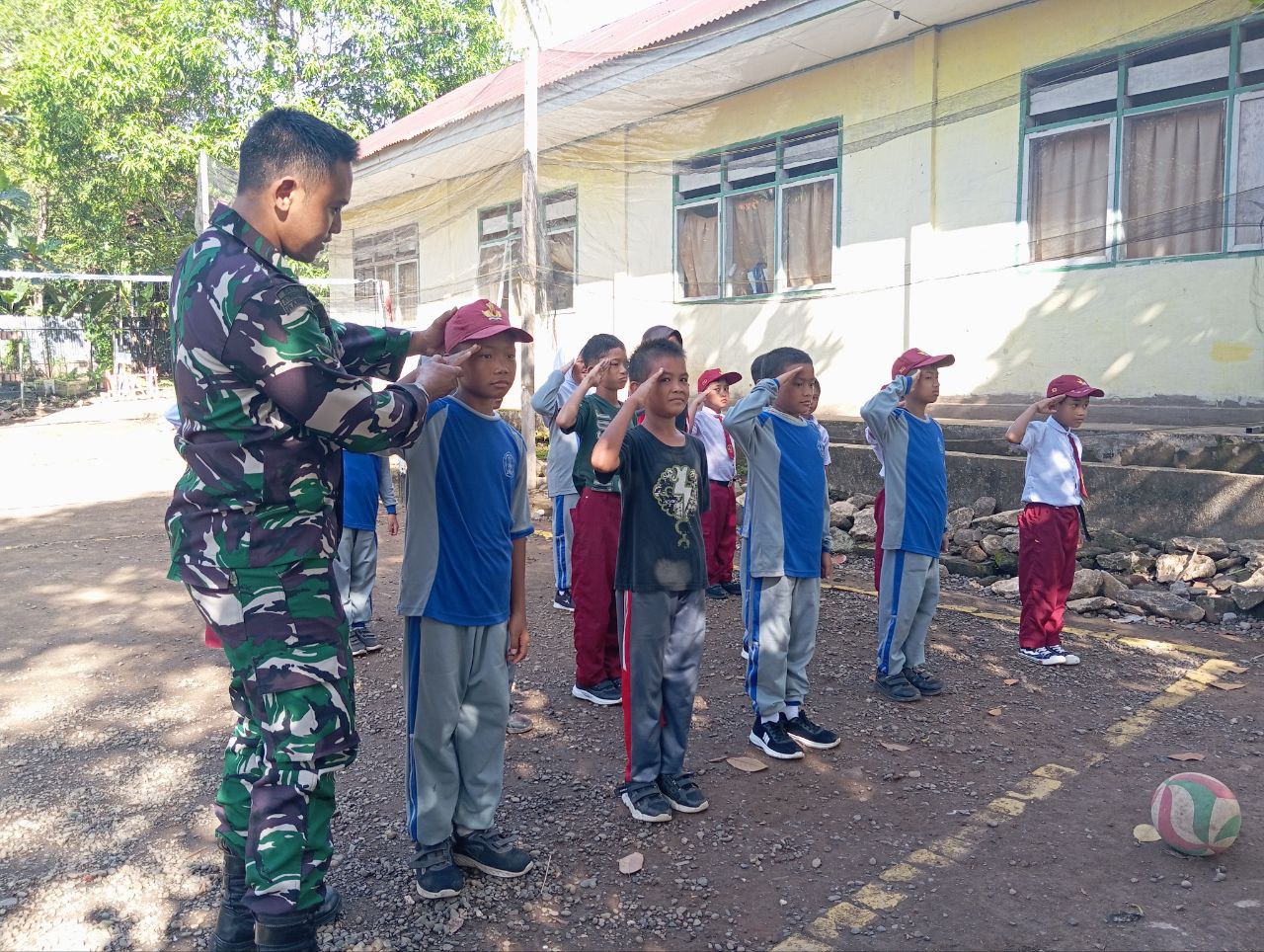BONE – Babinsa Koramil 1407-14/Libureng Serda Adi Murjab berikan pelatihan Peraturan Baris Berbaris (PBB) kepada siswa SD Inpres 12/79 Desa Binuang, Kec. Libureng, Kab. Bone. Kamis (25/09/25).
